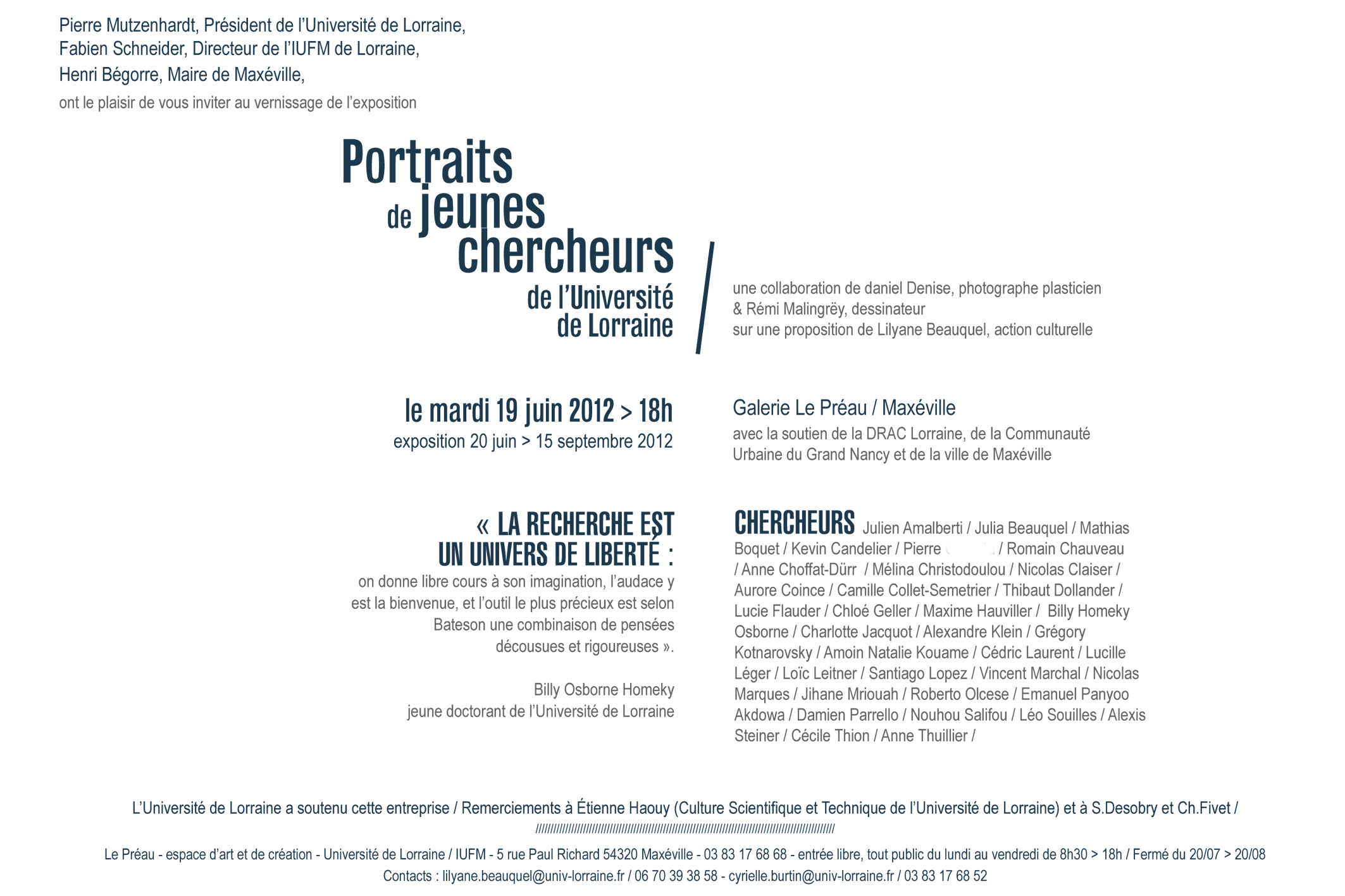 - Vous retrouvez "les Portraits de jeunes chercheurs "avec une nouvelle scénographie au sein de l'exposition "Eurêka" de Maxéville du 21 septembre au 15 décembre 2012 .